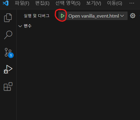 일단 launch.json 파일에 아무 것도 입력하지 않고, 다시 벌레 + 재생 표시 있는 버튼을 클릭해보면 디버그 모드로 실행할 수 있는 빨간색 동그라미 버튼이 뜬다. 누르면 디버그 모드로 실행된다.