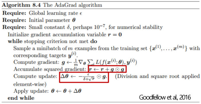 = 즉 현재 및 과거 시점의 gradient 크기에(g) 영향을 받아서 모수들(θ) 각각의 학습률이(ε) 결정됨 - Goodfellow, I., et al. (2016) Deep Learning : 모멘텀을 수식으로 증명