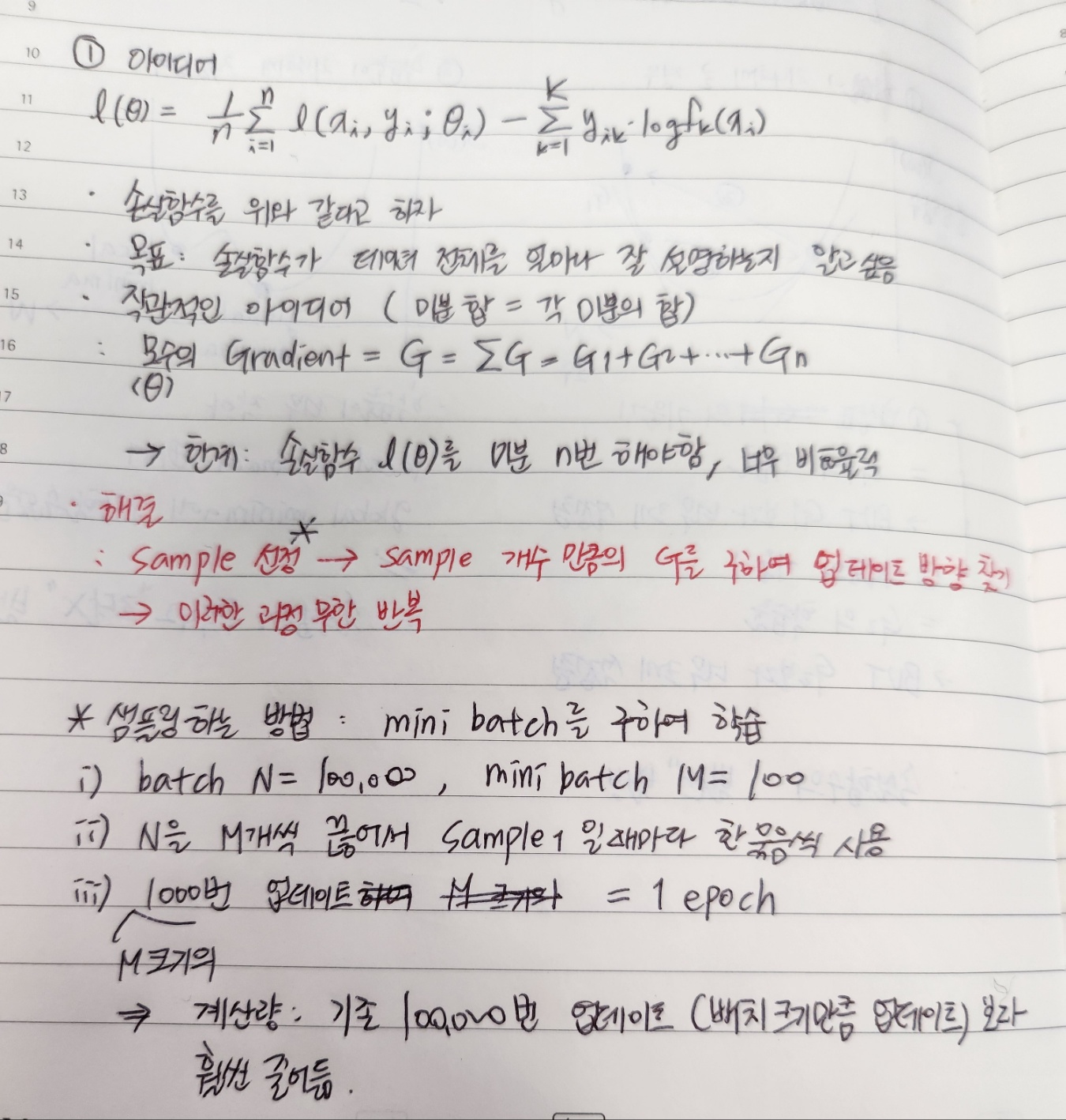 - Stochastic Gradient Descent (SGD): mini batch 를 샘플링하여 학습 → 파생적으로 에폭의 개념 나오게 됨